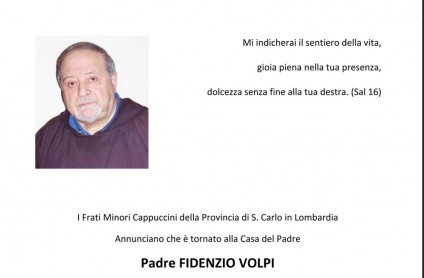 7. června odevzdal Pater Fidenzio Volpi OFM Cap. po krátké a těžké nemoci svou duši Bohu. Oznámila to lombardská provincie kapucínů San Carlo. Requiem za zesnulého bude 10. června v 10 hod. v římské bazilice San Lorenzo. Pochovám bude ve čtvrtek v 10 hodin na hřbitově v Bergamo.