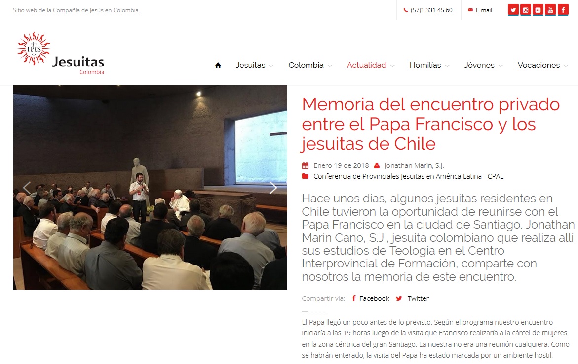 Tak jako při své minulé cestě sešel se Bergoglio v Santiagu de Chile opět s chilskými jezuity na „soukromé návštěvě“. Kolumbijský jezuita Jontathan Marín Cano byl rychlejší než jeho spolubratr Spadaro a uveřejnil již 19. ledna obsah této konference na internetových stránkách kolumbijských jezuitů. Ve své zprávě hovoří o nepřátelské atmosféře v Chile a o polemikách, které se týkají vysokých nákladů Bergogliova pobytu, sexuálních zločinů P. Karadimy a jmenování biskupa Barrose.