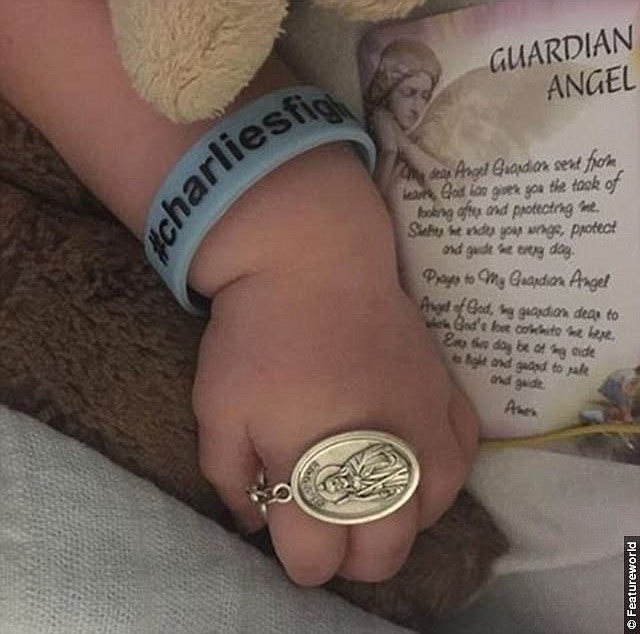 Na ručičku malého Charlieho umístili jeho rodiče medailku sv. Judy Tadeáše, světce, který pomáhá v bezvýchodných situacích, a dvě modlitby k andělu strážnému.