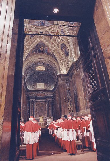 Capella Paolina v roce 1978 před konkláve k volbě Jana Pavla II.. Oltář je obnažen , kříž a obraz Panny Marie zmizely