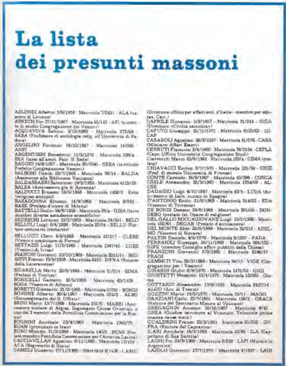 Po nějakém čase jsem doprovázel Dona Villu k jednomu vysoce postavenému hodnostáři, který byl velmi kovaný v problematice zednářů uvnitř církve. Byl jsem přítomen rozhovoru týkajícího se tzv. Lista Pecorelli (Pecorellův seznam zednářů v církvi) který byl uveřejněn v Chiesa viva několik dnů před oním pokusem otrávit Dona Villu. Jeden z přítomných opakoval slova, která o tomto seznamu prohlásil kardinál Silvio Oddi. Kardinál řekl: „Na tom seznamu jsou všichni jedna parta“, a ten druhý odpověděl: Lista Pecorelli je seznam osob kardinála Casaroliho“, a dodal: „Casaroli je hlavou čtyř vatikánských zednářských lóží. Pak následovala věta, která mi umožnila pochopit skutečný smyl zveřejnění tohoto seznamu, který zpracoval Mino Pecorelli, sám člen lóže č. 2 a vedoucí revue „OP“ („Osservatore Politico“).