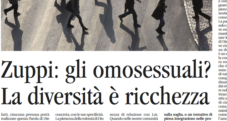Křížové tažení kato-gay vede Avvenire. Vůbec se nezmiňuje o materiálu, který vydala Kongregace pro nauku víry již před 34 roky. Stačí otevřít list italské biskupské konference a najdeme zde palcový titulek: »Zuppi: Homosexuálové? Různost je bohatství«. Tomuto kardinálovi vůbec nevadí, že Katechismus katolické církve a celá její tradice řadí sodomii mezi čtyři hříchy, které před Boží tváří volají o pomstu. Boží vůle se podle těchto apoštolů lží mění od osoby k osobě a je prý pak v ní vtělená ad personam a my si ji teď jen osvojujeme. Homosexuální chování může být podle Zuppiho pro jednoho ctností a pro druhého neřestí. Proč takováto variabilnost Boží vůle existuje jen pro homosexualitu? Proč by se nemohla aplikovat na pedofilii nebo zoofilii?Směrodatné jsou jen obyčeje ideologických syndikátů a organizovaných skupin LGBT?