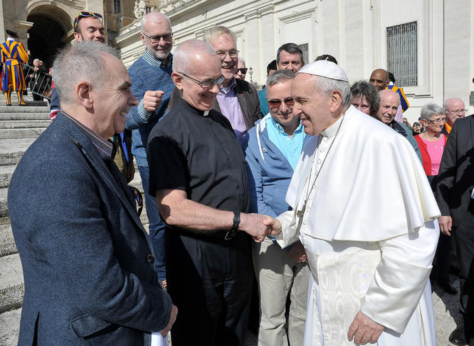 Nejdříve zaujali na Náměstí sv. Petra při generální audienci předem vyhrazená místa a po audienci byli pozvání na osobní setkání s papežem Františkem. Nejedná se tedy o nějakou kradmo pořízenou fotografii. Tato reklama se objevila na portálu Progetto Gionata - portale su fede ed omosessualità. (Projekt Jonáš, portál o víře a homosexualitě.) Skupina s sebou přinesla poselství svého arcibiskupa, kardinála Nicholse. Její vedoucí Martin Pendergast představil skupinu usmívajícímu se papeži Františkovi a vyložil mu její aktivity.