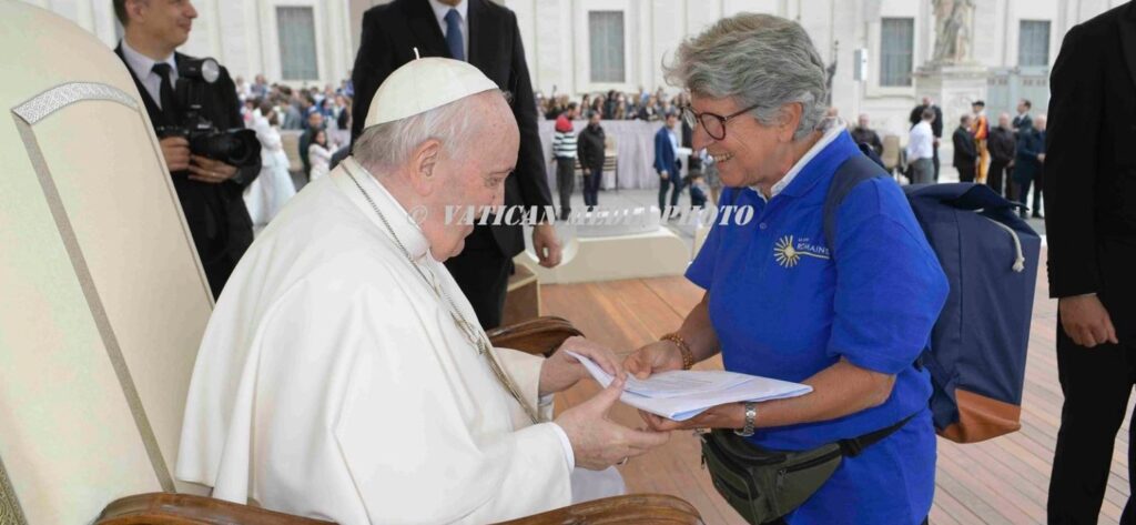 Diane z La Voie Romaine předává Františkovi na konci generální audience dvě obálky a batoh s 2500 dopisy pro tradiční obřad, které byly do Říma přineseny pěšky.