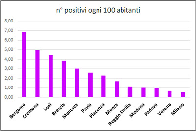 V současné pandemii stojí Bergamo na prvním místě v absolutním počtu pozitivních případů vzhledem k počtu obyvatel: 7 pozitivních na 100 obyvatel, jak je vidět na přiloženém grafu z 28. března 2020.