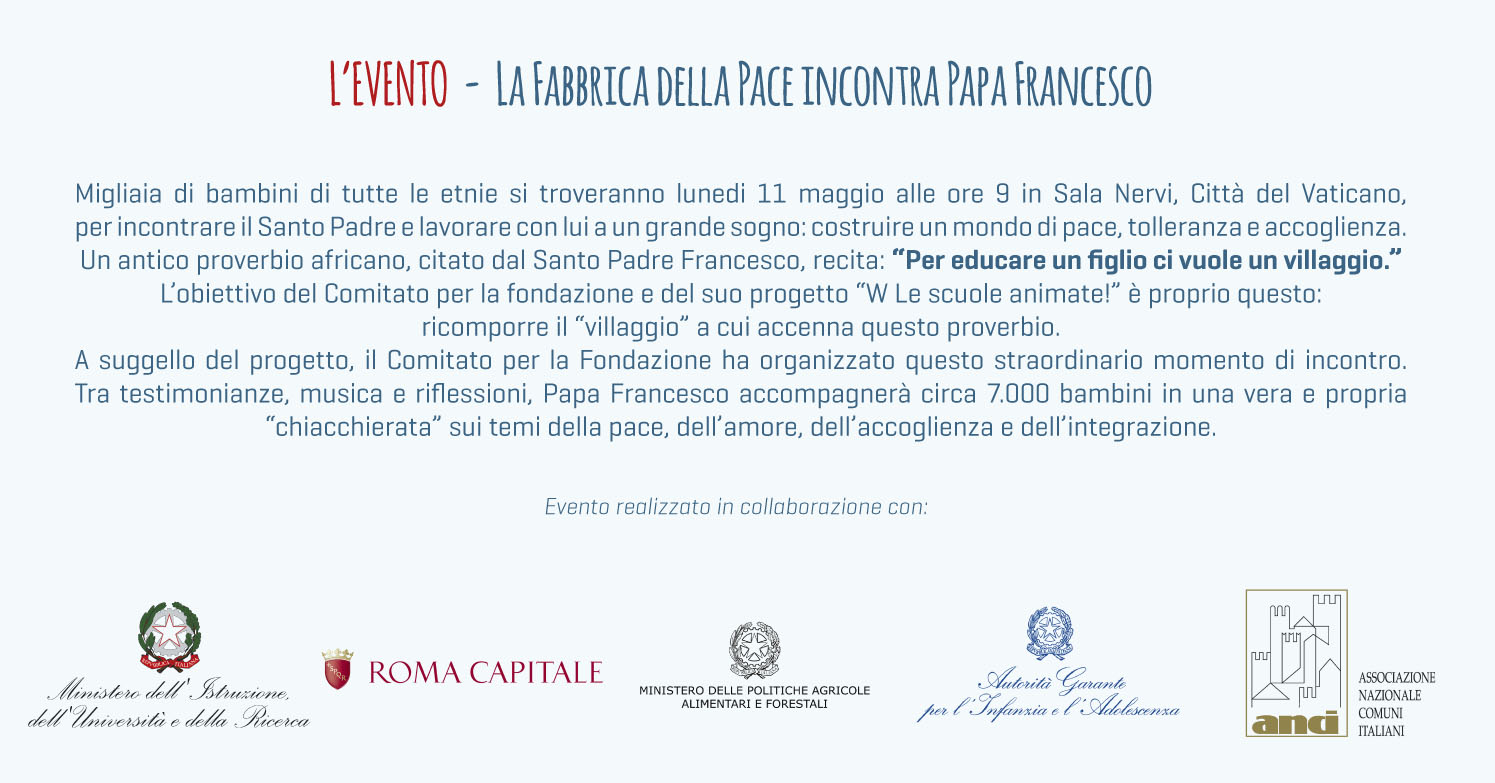 Pozn: Setkání školní mládeže se konalo 11. května ve Vatikáně v sále Nervi. Tisíce školních dětí sesetkalo s papežem, aby „s ním spolupracovali na velkém snu o míru, toleranci a vzájemném přijetí“. (viz poslední ilustrace)