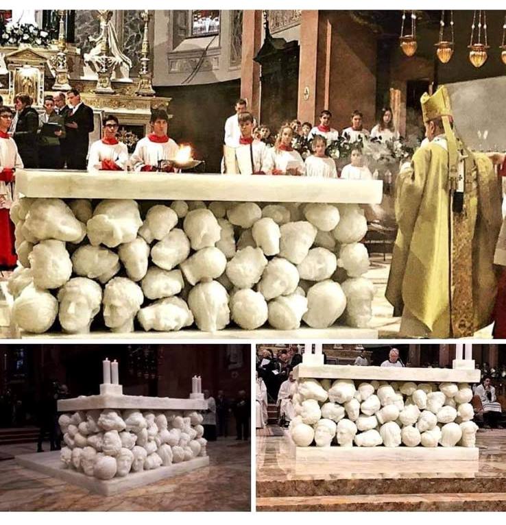 Nový oltář je složen z hlav antických děl, jejichž kopie umělec zhotovil. Hlavy představují celé lidstvo nerozdílně sjednocené uzavřené mezi dvě desky z onyxu.