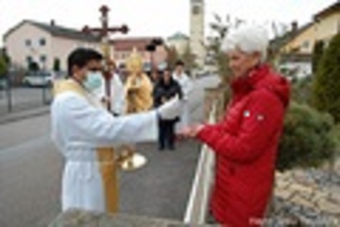 Farář Michael Hirmer podává svaté přijímáni po mši svaté. Každou neděli vycházejí kněží s Nejsvětější svátosti na ulici. »Pán přichází k vám«, napsal farář farníkům.