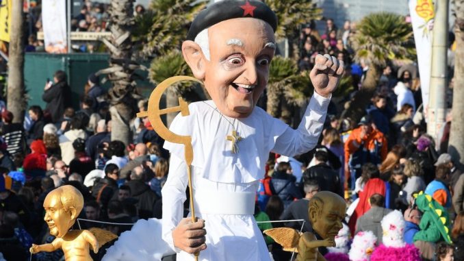 Na tradičním karnevalu ve Viareggio nemohl scházet Papa- komunista se srpem a kladivem a zaťatou pěstí spolu se svými pěti andělíčky Marxem, Engelsem, Leninem a Che Guevarou".
