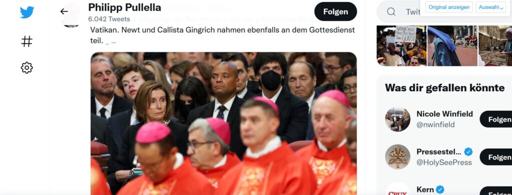 Při včerejší slavnosti knížat apoštolů Petra a Pavla se Pelosi zúčastnila oslav ve svatopetrské bazilice. ( přítomen byl také arcibikup Graubner. ) Papež František necelebroval osobně kvůli svým potížím s kolenem, ale koncelebroval. Při této příležitosti Pelosiová přijala svaté přijímání bez překážek a s patřičným mediálním doprovodem, přestože její domovský biskup stanovil její exkomunikaci. Předsedkyně americké Sněmovny reprezentantů se samozřejmě neodvážila udělat žádný nepovolený krok, natož aby si vynutila přijímání. Její cestu do Říma připravil arcibiskup Cordileone, mimo jiné prostřednictvím arcidiecéze federálního hlavního města Washingtonu. Tam od roku 2019 vládne Wilton Daniel Gregory, jeden z McCarrickových chlapců, kterého František jmenoval kardinálem. Philipp Pulella, vatikánský zpravodaj agentury Reuters, byl předem informován a zajistil pro Peloiovu cestu ke svatému přijímání potřebnou mezinárodní pozornost.
