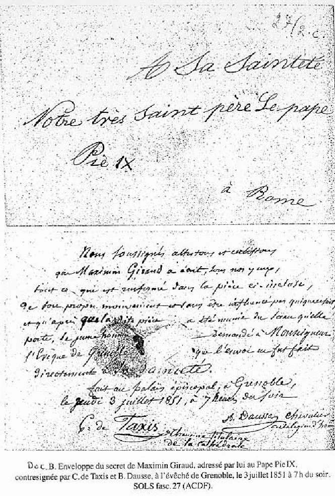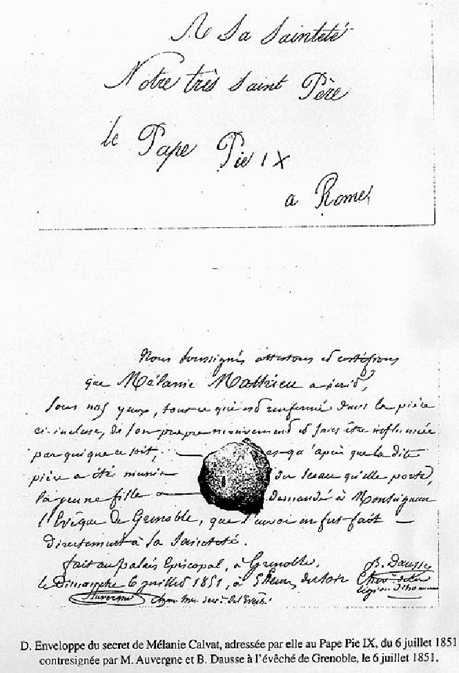 Společnost se nachází v předvečer hrozných trestů a těžkých událostí; lidé mohou očekávat, že budou spravováni železným prutem a budou pít z kalicha Božího hněvu. Nástupce mého Syna, papež Pius IX., ať neopouští Řím po roce 1858; ať zůstane pevný a velkodušně bojuje zbraněmi víry a lásky a já budu s ním. Pohleďte na Napoleona: má rozdvojené srdce a až bude chtít být současně papež i císař, Bůh ho opustí. On je onen orel, který touží vzlétnout stále výše, ale dopadne na meč, který chtěl použít a přinutit národy, aby ho zbožňovaly. Itálie bude potrestána za své ambice setřást jho Pána pánů; tak v ní propukne válka, krev poteče ze všech stran; chrámy budou zavřeny nebo znesvěceny; bude se pořádat hon na kněze a řeholníky; budou posíláni na krutou smrt. Mnozí opustí víru a počet kněží a řeholníků, kteří opustí pravou víru, bude veliký. Budou mezi nimi dokonce biskupové. Papež ať je na stráži proti těm, kteří budou konat zázraky, protože nastala doba, kdy se budou na zemi i na nebi dít mimořádné divy.