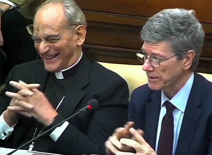 Minulý týden překonal všechny hranice slušnosti dvěma epizodami, které vyvolaly reakce a skandál. Jedna z nich se týká už kolikátého kongresu, které monsignore Sorondo s oblibou organizuje, tentokrát na téma „Nové formy solidarity – K bratrskému spojení, integraci a inovaci“. Konala se 5. února a mezi třemi hlavními referenty byl opět Jeffrey Sachs, který ve svém referátu spustil dlouhou tirádu proti prezidentu Trumpovi a líčil ho jako smrtelné nebezpečí pro svět, které bude prý ještě horší, jestli v příštím listopadu vyhraje volby.Nehledě k tomu, nakolik je vhodné, aby se vatikánské konference staly volební tribunou, je otřesné vidět, jak se Sorondo vedle Sachse chechtá a baví inzultacemi svého souseda a tleská (sám) obzvláště ofenzivnímu výroku ( qui ).