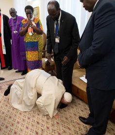Nuže málokdy byla církev tak ponížena jako tímto gestem papeže Františka - na kolenou u nohou politických lídrů a vyznavačů jiného náboženství. František je totiž zde na zemi náměstkem Krále králů, jemuž se všichni musí klanět. Nemůže být žádný pravý mír mimo pravdu zvěstovanou tím, kdo je jediným Vládcem pokoje, naším Pánem Ježíšem Kristem.